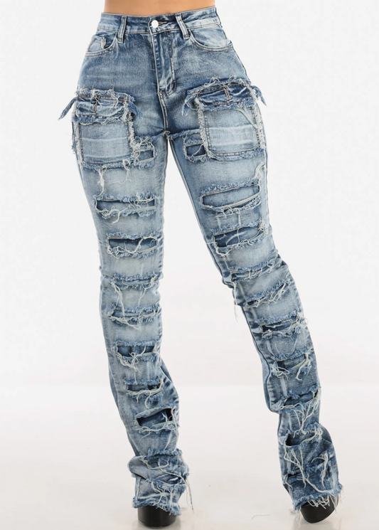 Stretchy High Waist Ripped Cargo Stracked Leg Jeans Blue Wash