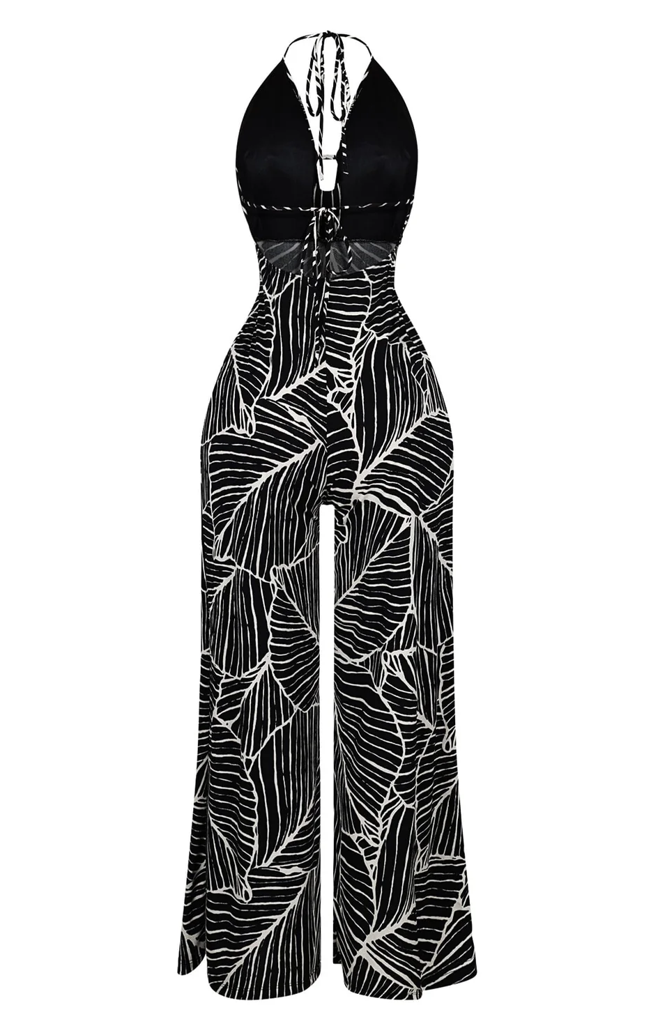 Printed mesh sleeveless jumpsuit featuring a plunging cowl neckline and a flowy wide leg silhouette