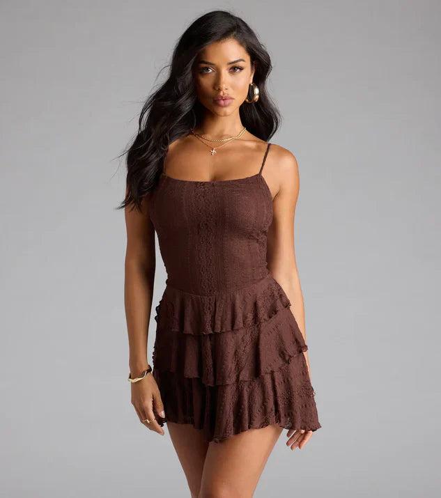 Arrive on the scene like a daydream in this lace skater dress with flirty ruffles and mini-length hem that'll get you all the compliments!