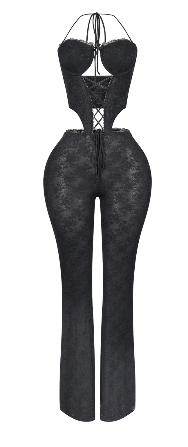 Mesh lace halter jumpsuit featuring padded bustier, lace up details, and an open back